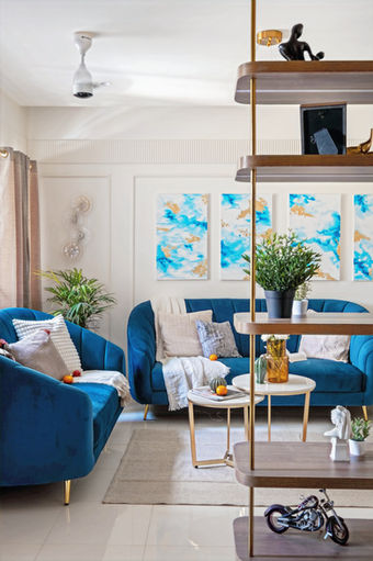 The living room, bathed in soft opaline whites, is elevated by delicate gold accents and classic wall mouldings, which echo timeless European charm.
